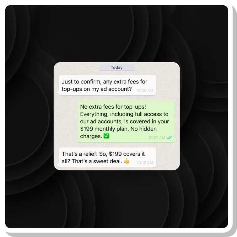 Tired of hitting daily or lifetime spending caps? With our agency ad accounts, you can spend as much as you want, whenever you want. Whether you're running small tests or scaling big, you have full control over your budget.